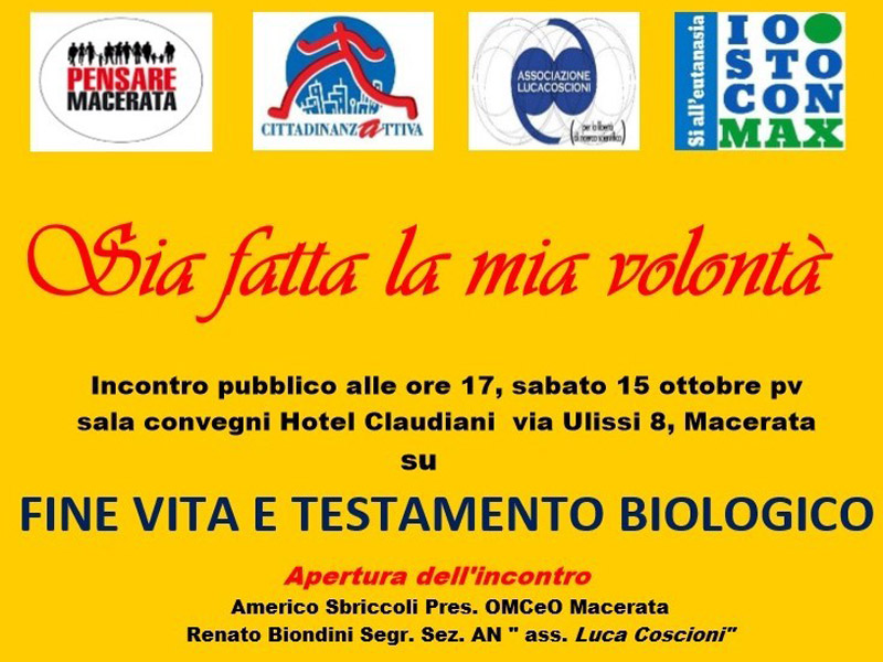 “Sia fatta la mia volontà“. E’ questo il titolo dell’incontro sul tema del fine vita e del testamento biologico che si svolgerà a Macerata il 15 ottobre alle ore 17 presso la sala convegni dell’Hotel Claudiani, in via Ulissi 8. Dopo che il 28 giugno scorso il Consiglio comunale di Macerata ha approvato un ordine del giorno presentato dal consigliere e capogruppo di Pensare Macerata David Miliozzi per l’istituzione di un registro dei testamenti biologici (detto anche più propriamente dichiarazioni anticipate dei trattamenti sanitari) si è deciso di tenere un incontro pubblico per sensibilizzare i cittadini e le istituzioni sulle tematiche del fine vita e in particolare sull’importanza di istituire anche a Macerata il registro delle dichiarazioni anticipate di trattamento sanitario.