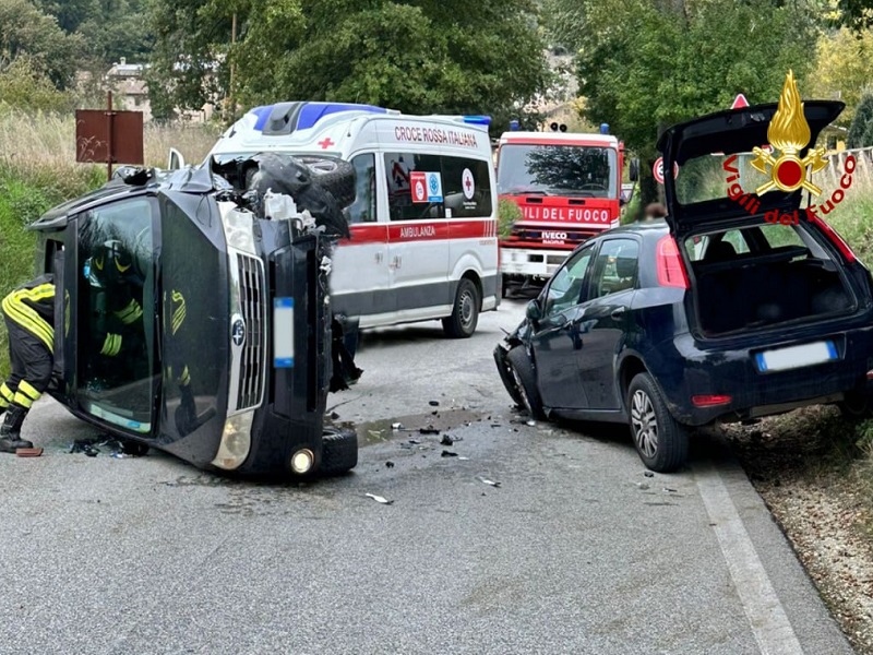 L’incidente si è verificato intorno a mezzogiorno lungo la Strada Provinciale 98 “Polverina-Fiastra”. In seguito al violento impatto, una delle vetture si è ribaltata parzialmente su un lato.